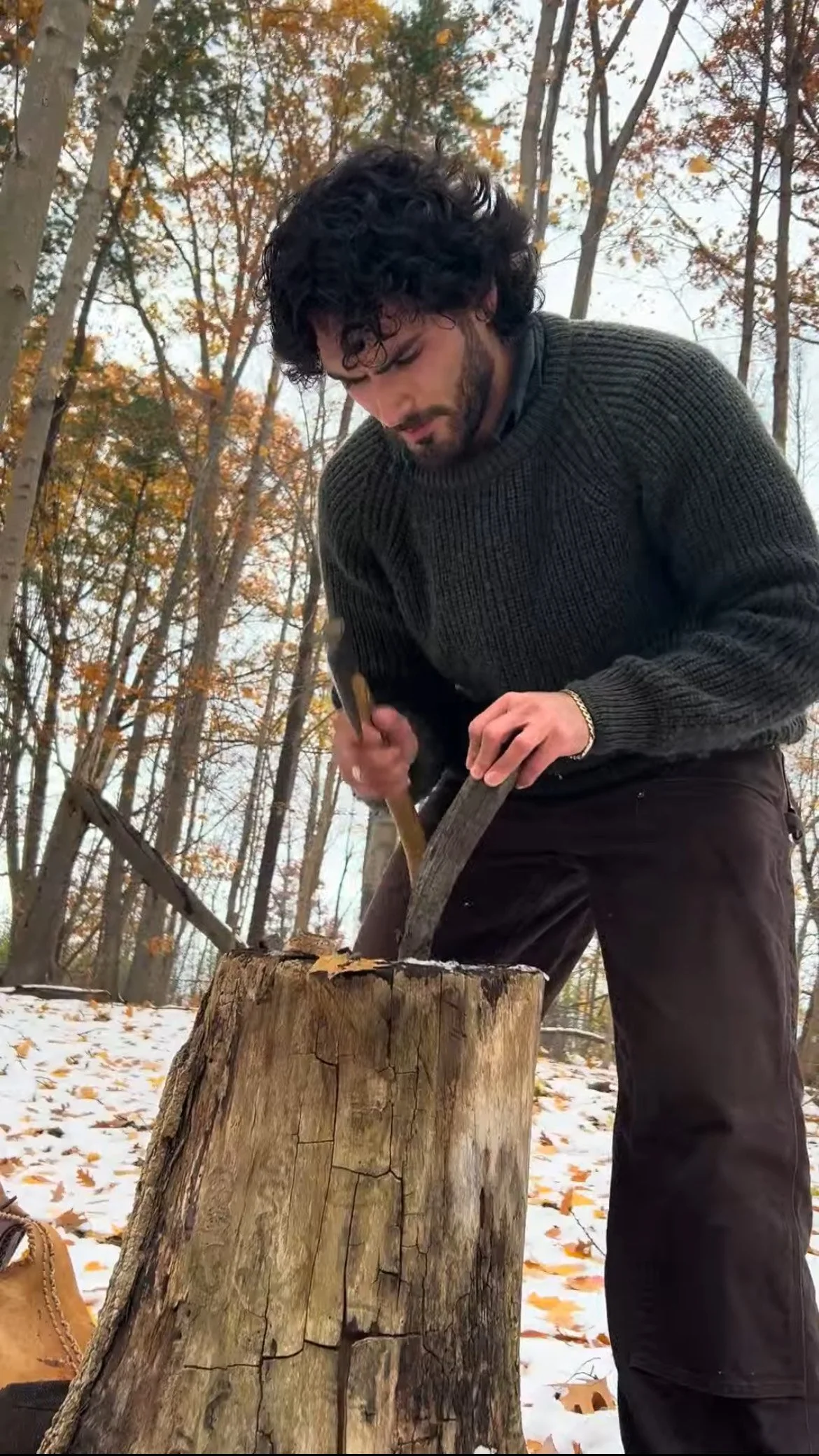 I started whittling during the first wave of the COVID-19 lockdowns. Like many, I suddenly had a lot of time on my hands and quickly became bored with my other hobbies. I came across a video of a man carving a little gnome figurine and it interested me so much that I figured I would give it a shot. My version might have been quite funny looking, but I was hooked. I spent some time carving these little figurines before I realized I wanted to create something more practical and useful in my everyday life. This led me to spoon carving and green woodworking in general, which means utilizing fresh, wet logs and branches. I’d spend hours out in the woods looking for naturally fallen branches and then use an axe and some knives to make spoons of all different sizes and shapes.