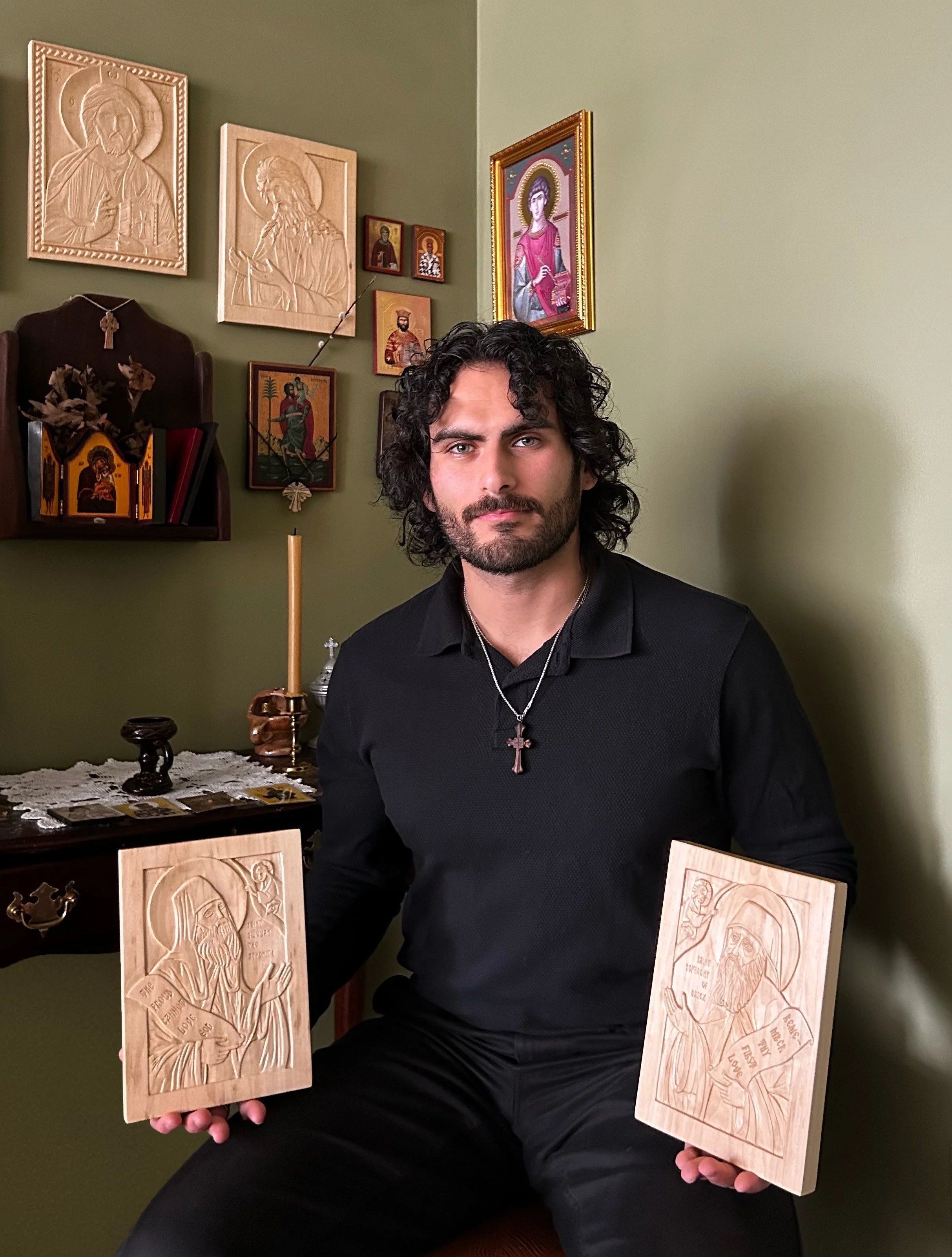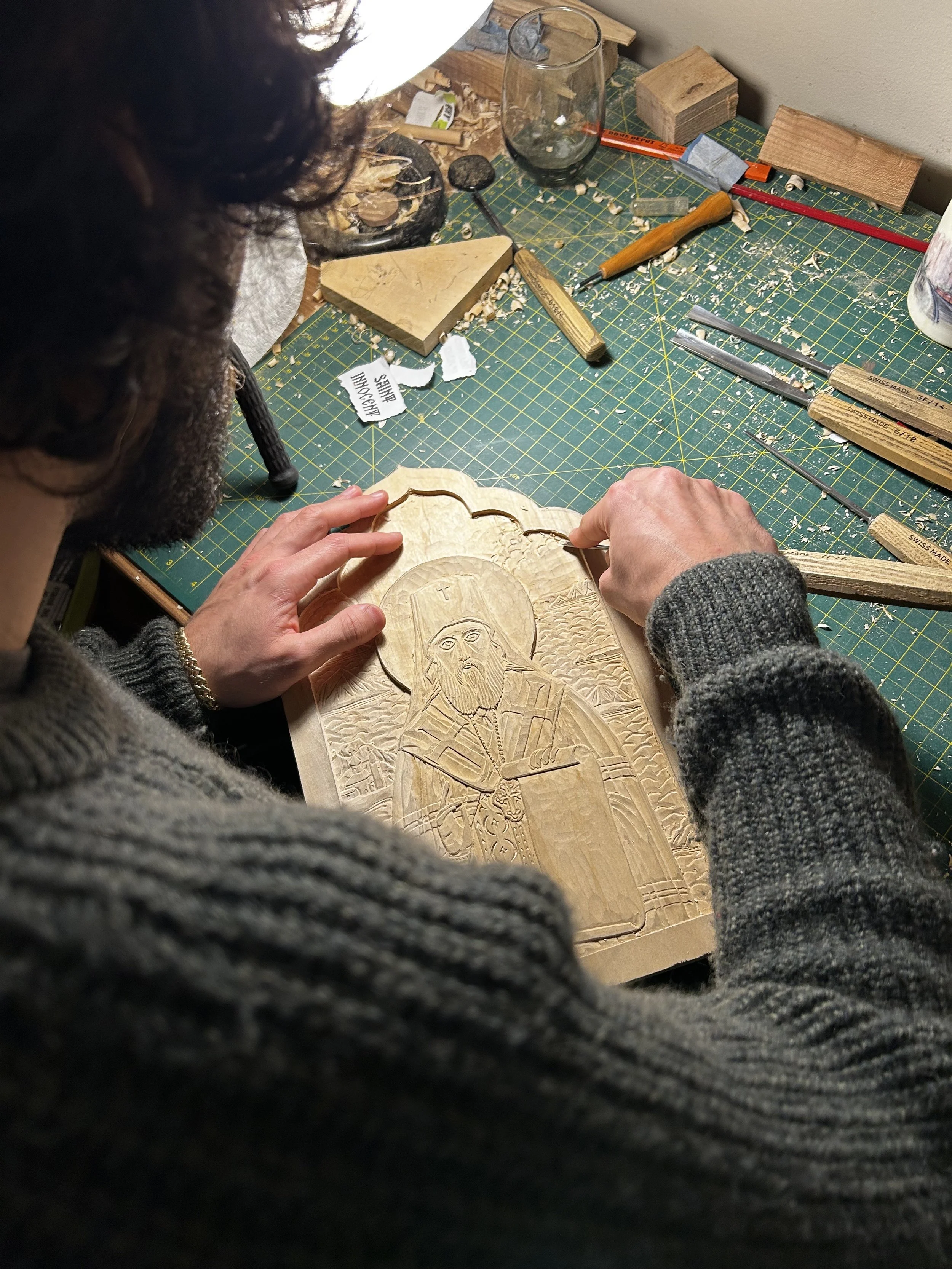 Most recently I’ve carved a set of Icons of Saint Silouan the Athonite and Saint Sophrony of Essex. I’m currently finishing up an Icon of Saint Innocent of Alaska. It has been such a blessing having the opportunity to carve Icons for people.